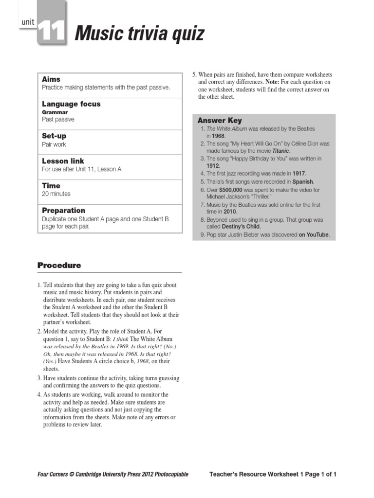 If you can guess these 15 songs from 2011, you're a musical genius. Play or print these music questions and answers tests. List of music quiz with answers. Do you know the most popular songs . Do you know the most popular songs of 2012 and who recorded these?